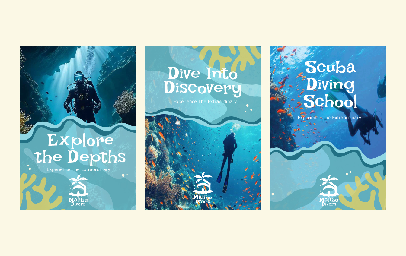 Malibu Divers’ illustration style embodies a relaxed, ocean-inspired aesthetic that aligns seamlessly with its brand identity. Utilizing beachy colors such as soft blues, sandy neutrals, and sun-kissed corals the artwork evokes the serenity of the sea. Organic shapes and smooth, flowing lines create a natural harmony, mirroring the effortless movement of water and marine life. This cohesive blend of color and form enhances the brand’s adventurous yet tranquil vibe, making scuba diving feel both exciting and inviting.